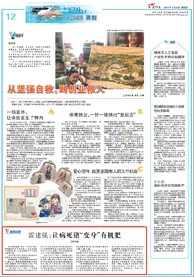 《福建日報》刊發“雷建強:讓病死豬變身有機肥”雙創人物專題報道 2019年09月05日