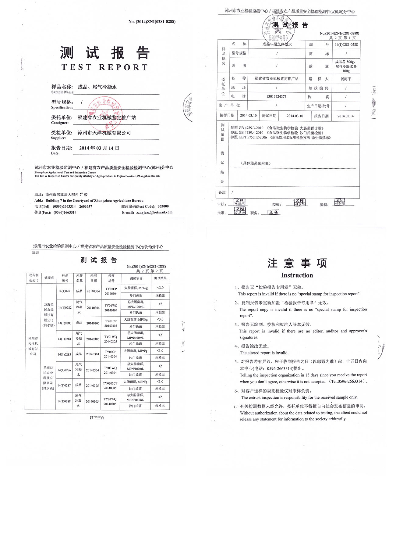漳州市農業檢驗監測中心/福建省農產品質量安全檢驗檢測中心(漳州)分中心測試報告--成品、尾氣冷凝水檢測